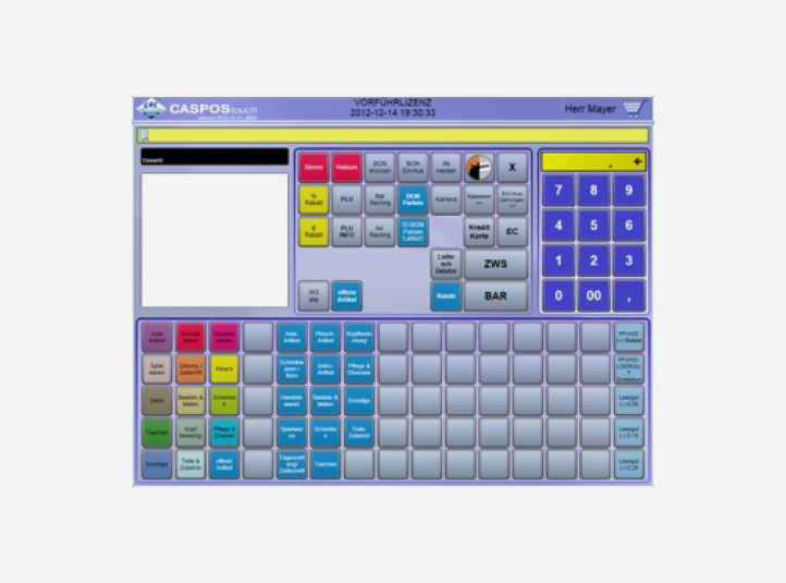 Herzstück der CASPOStouch-Kasse ist das auf Touchscreen basierende Kassenprogramm. Intuitive Bedienung ermöglichen Ihne und Ihren Mitarbeitern ein einfaches, reibungslosens Kassieren. Zahlreiche, praktische Module helfen Ihnen, die Administration in Ihrem Betrieb auf ein Minimum zu reduzieren und nach kurzer Einarbeitungszeit, die täglichen Arbeiten schnell und effektiv zu erledigen.